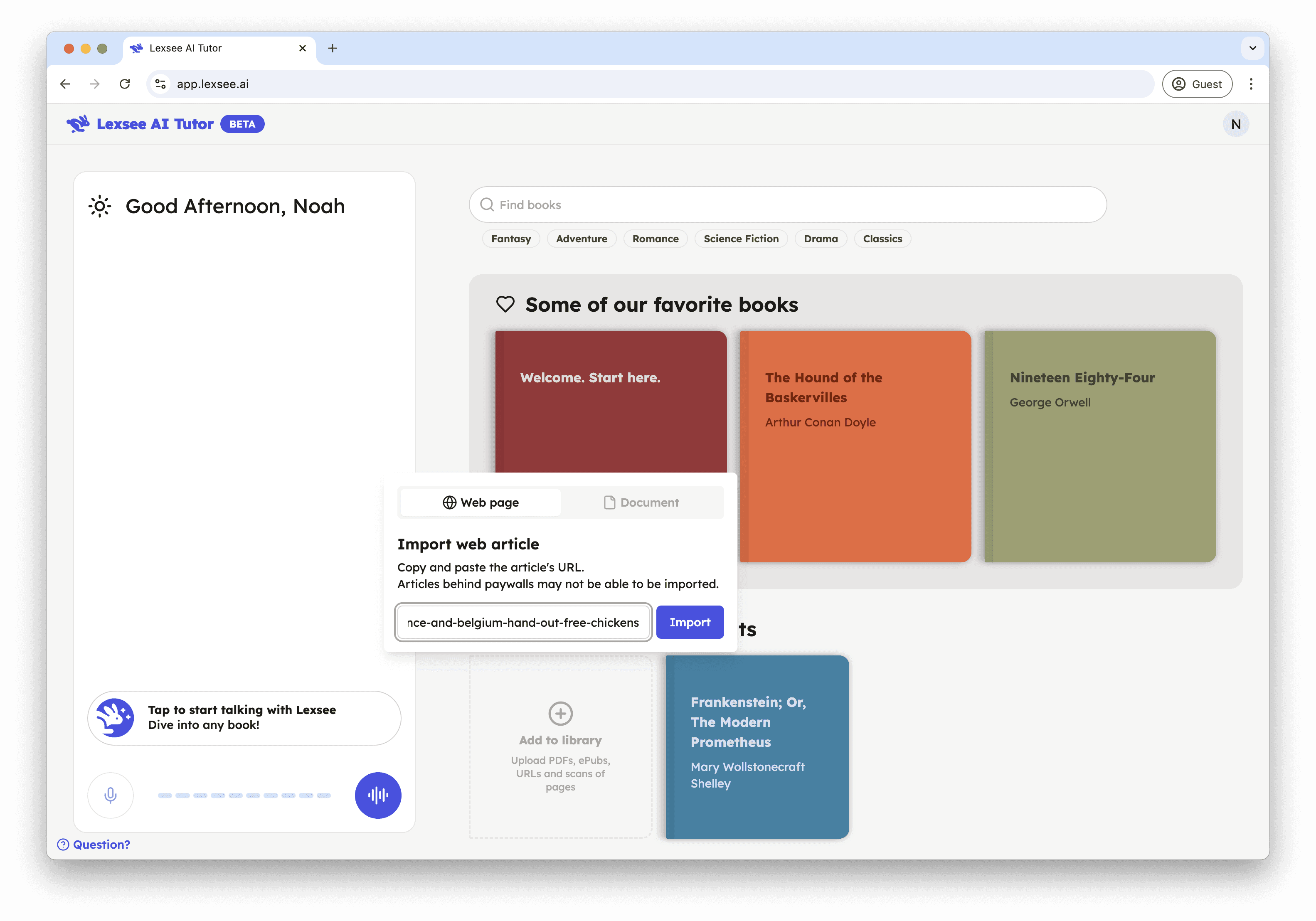 Most web pages can be added to your library. Open the Add to library button to open the upload dialog and paste the URL of page or article you'd like to add. Next click Import.