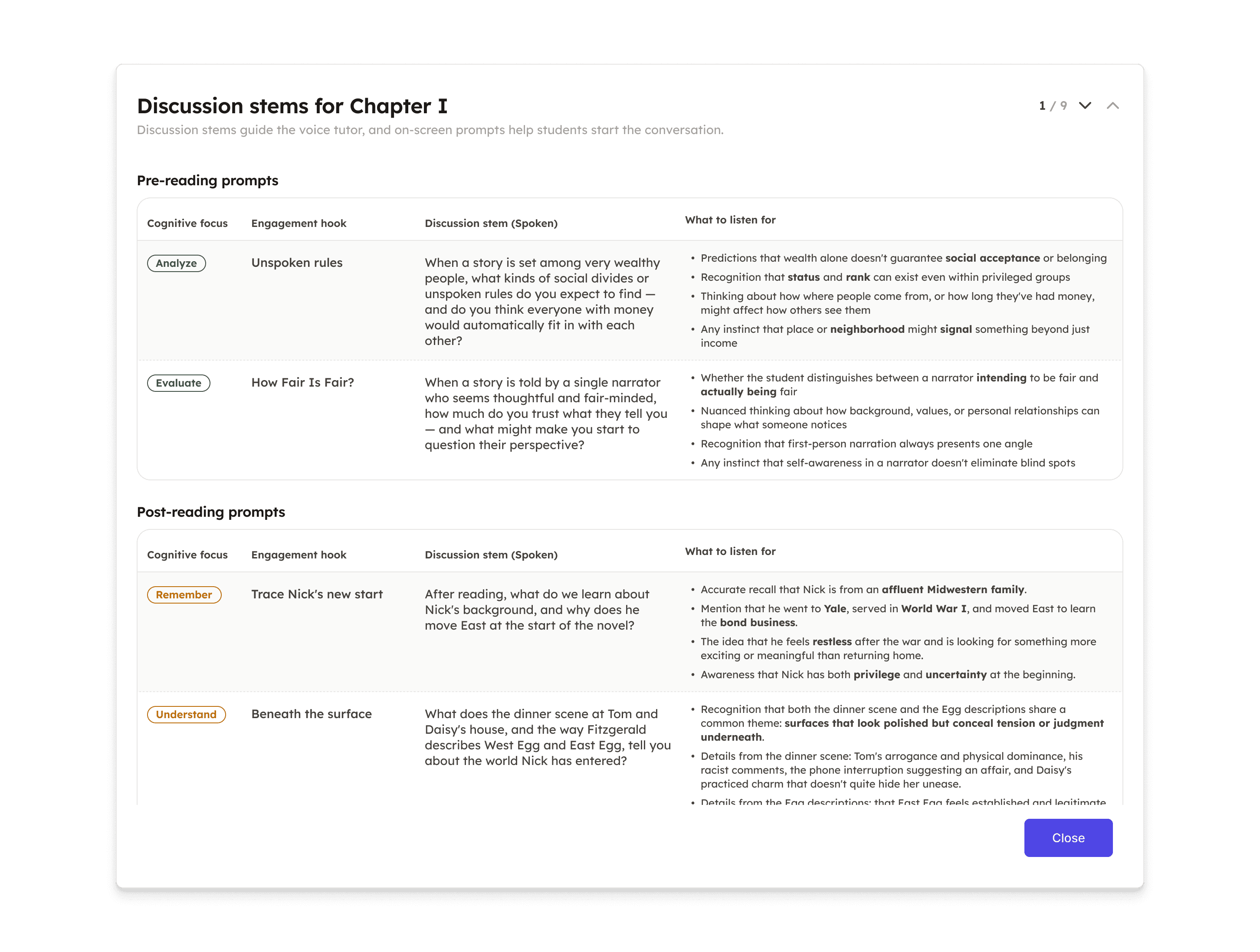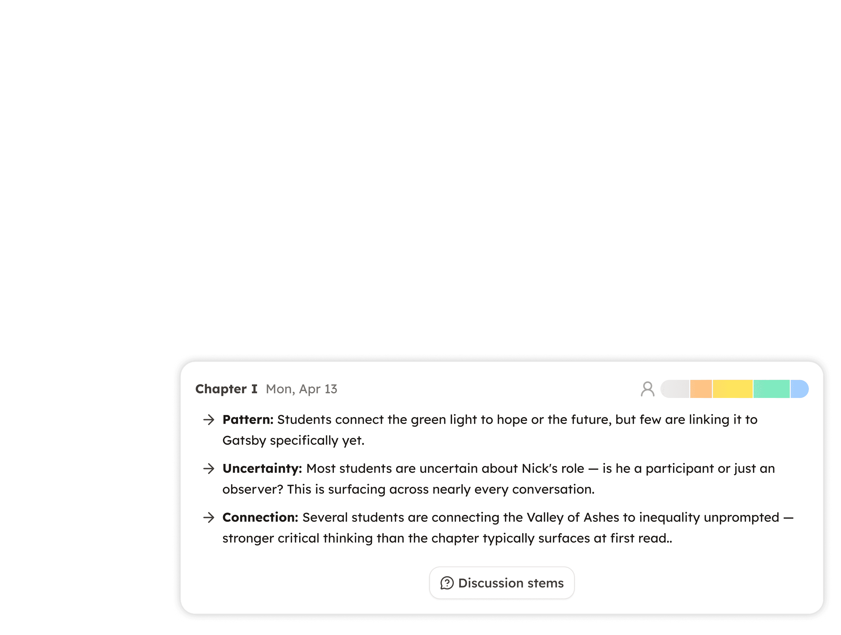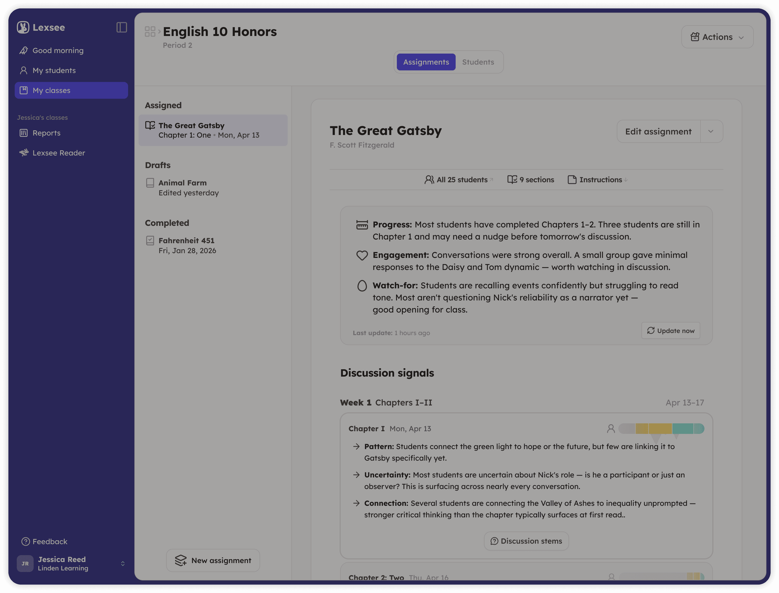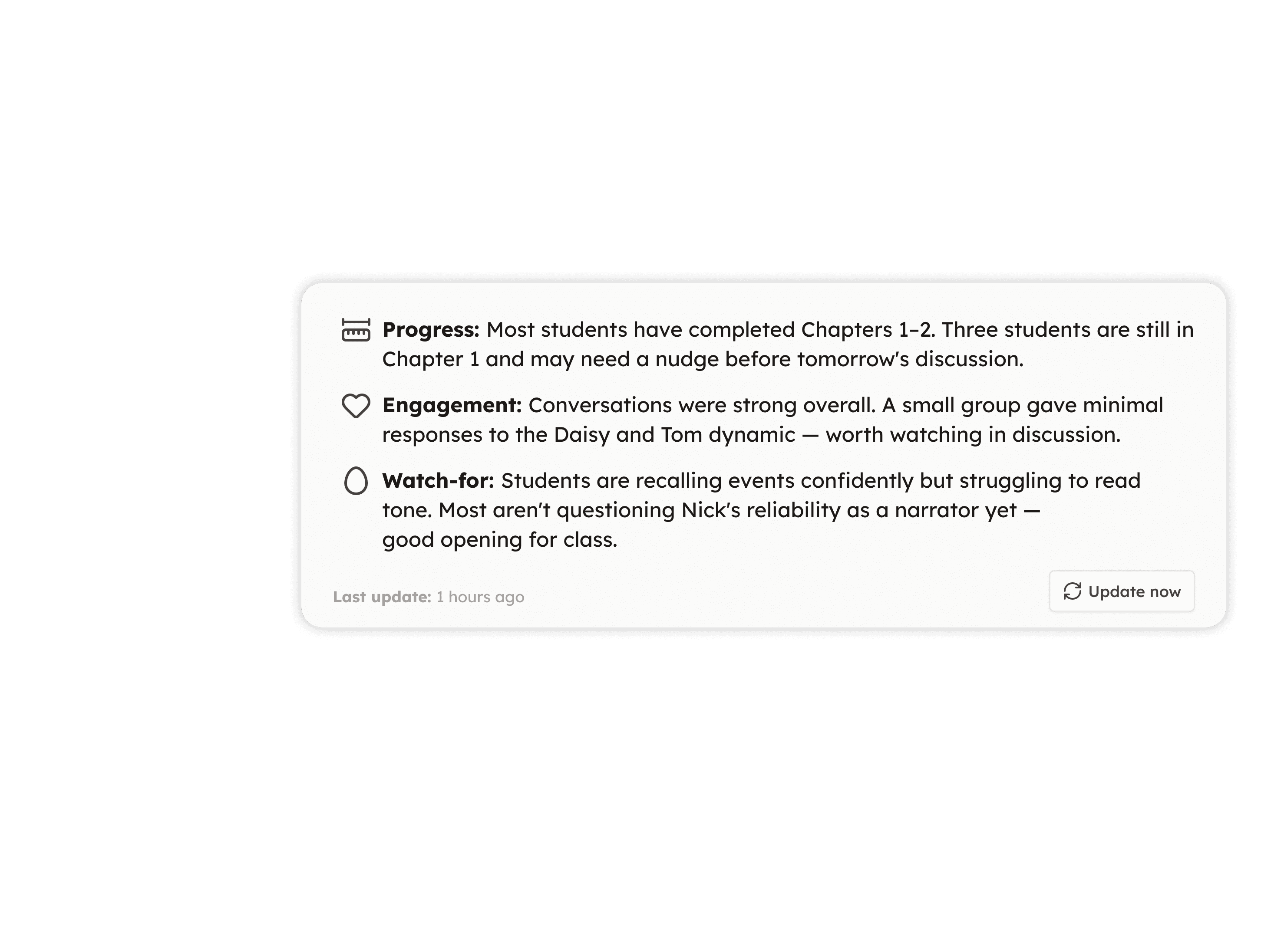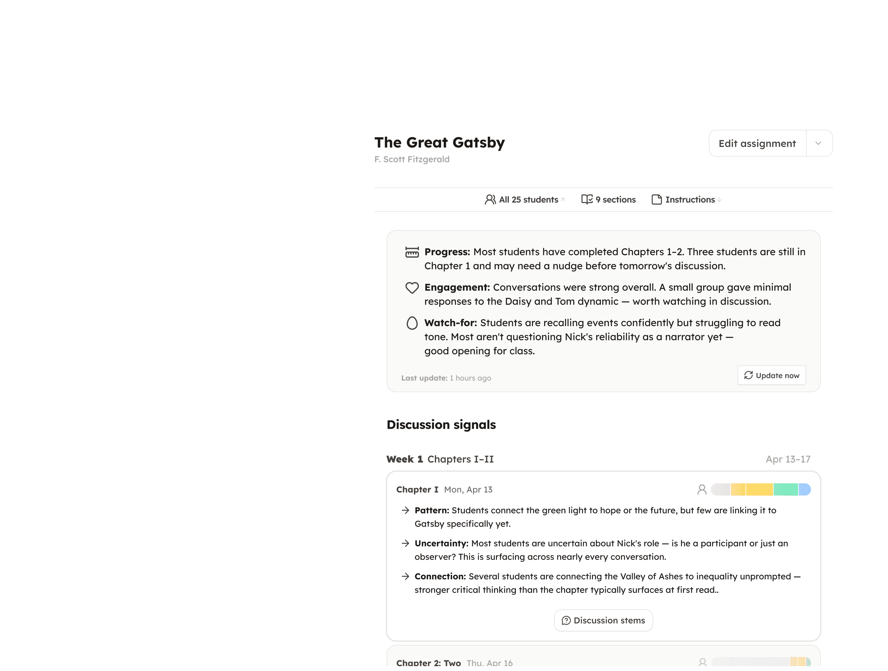 Every teacher in your school gets a guided reading tool that works between classes — giving students the comprehension support they need and giving teachers the insight to lead sharper discussions. Teachers see progress, engagement, and discussion signals for every student, organized by assignment. No training required, and no change to what they're already teaching.