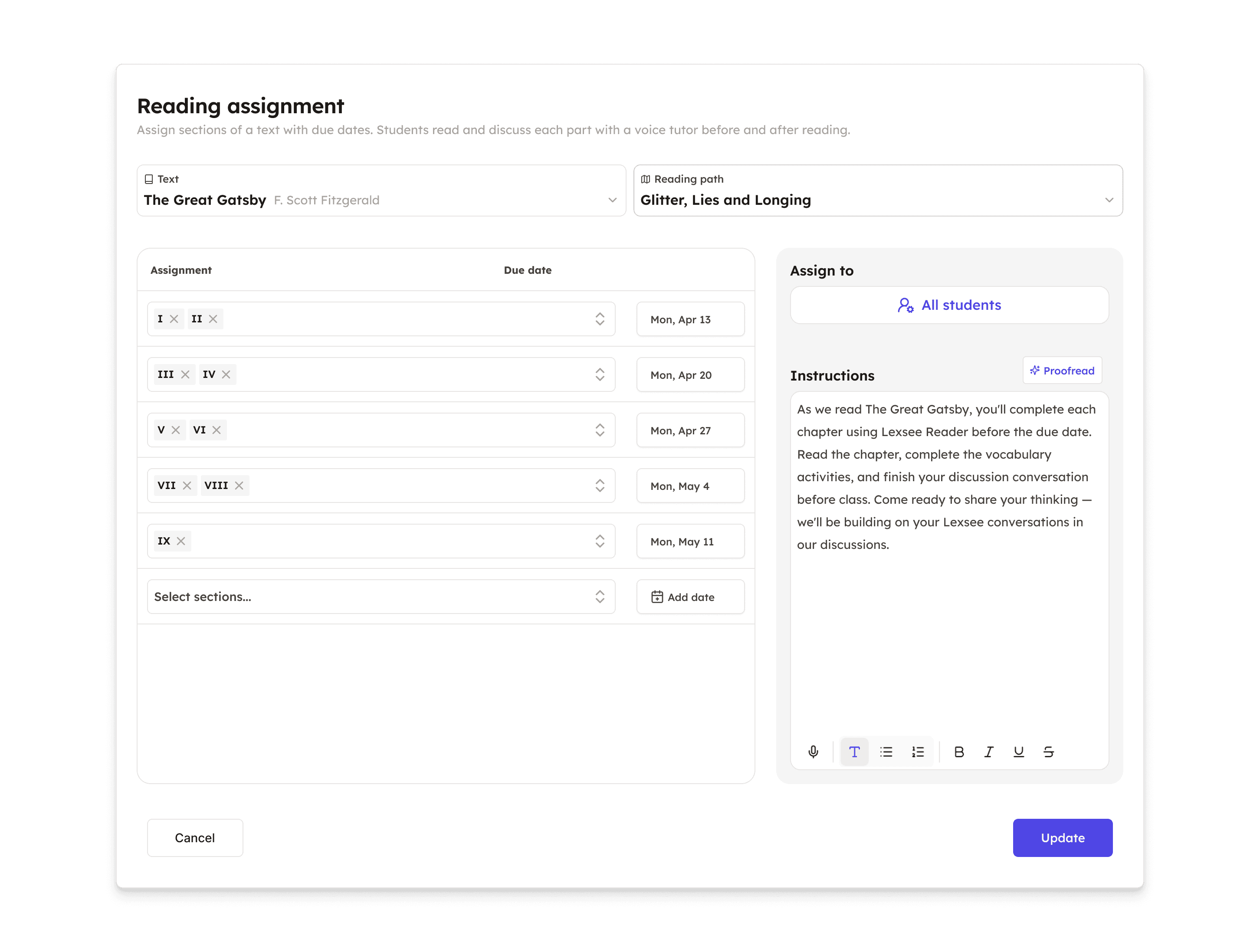Your teachers are already stretched. Every student needs something different, and there are only so many hours in a day. Lexsee gives each student a guided reading conversation with their assigned text — so your teachers walk into class knowing exactly what each student understood, where they struggled, and what the discussion should focus on.