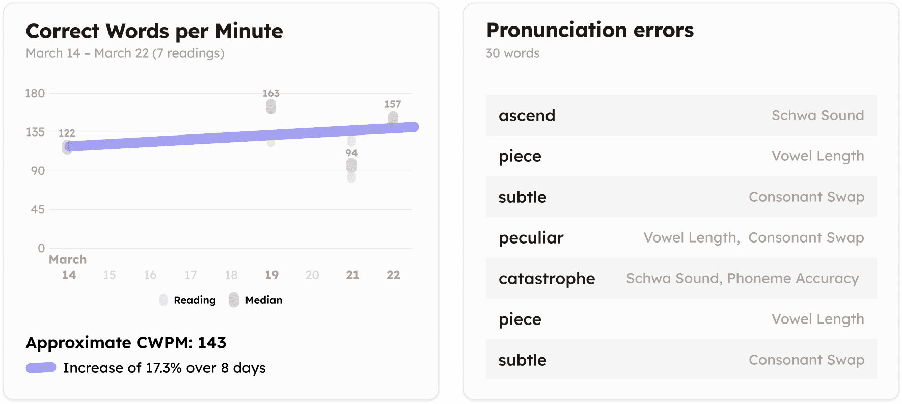 Streamline sessions with tools designed to track progress, measure fluency, and generate personalized reading exercises.